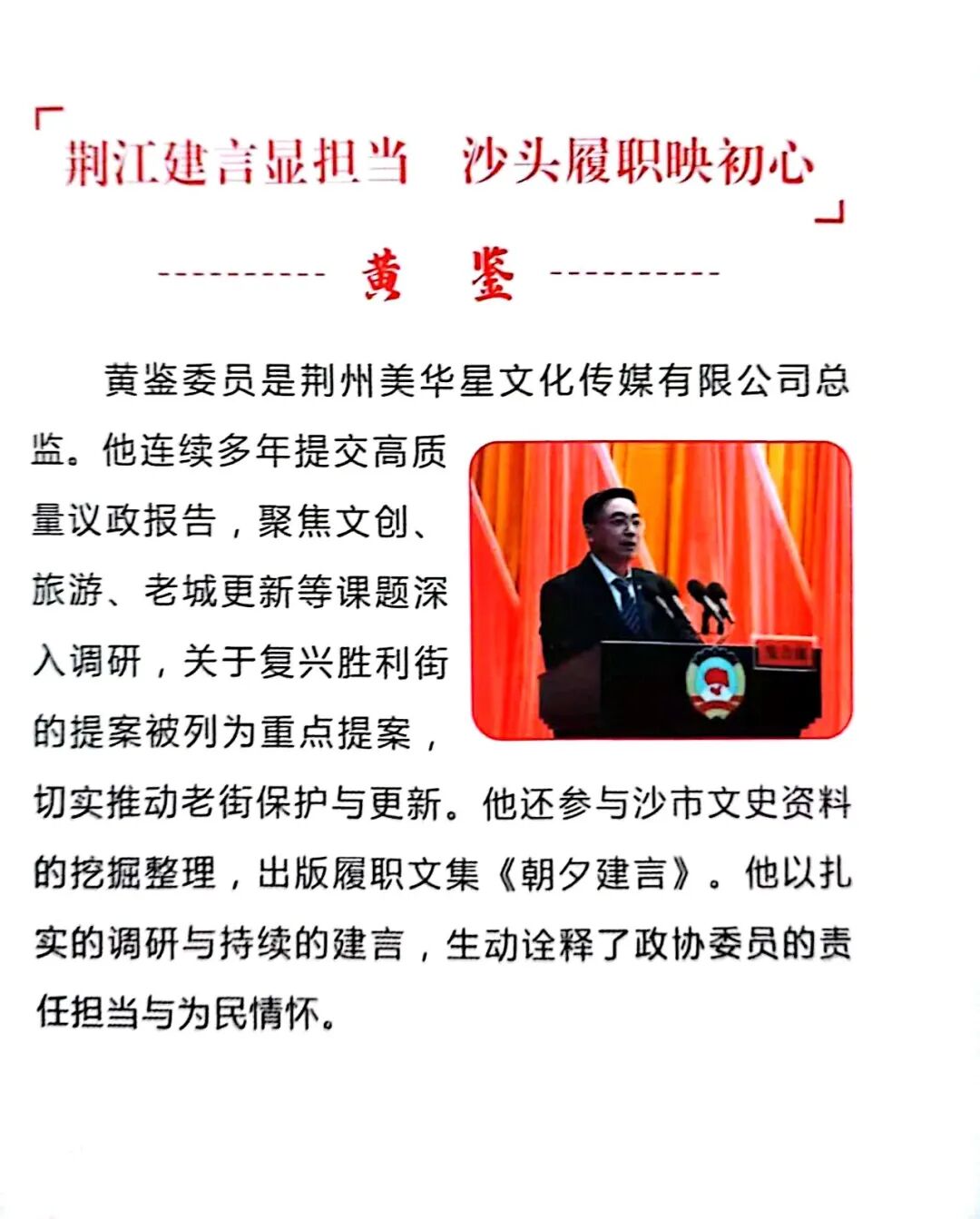 岁末凝共识,奋进启新程。12月28日至31日,政协沙市区第七届委员会第五次会议、沙市区第七届人大第五次会议在区委大礼堂相继召开,奏响了沙市“勇当领跑者、冲刺千亿区”的时代强音。民进沙市区总支的14名政协委员与2名人大代表,怀揣履职热忱与民生期盼,以饱满姿态投身“两会”各项议程,用扎实调研、精准建言书写了新时代参政党的责任担当,在参政议政的广阔舞台上彰显了民进会员的别样风采。会议期间,代表委员们认真聆听区委书记卢永桢同志开幕致辞,细致审议政协常委会工作报告、政府工作报告等重要文件,在小组讨论中踊跃发声、各抒己见。他们立足沙市发展实际,紧扣“十四五”收官与“十五五”谋划的关键节点,结合教育、文化、经济、民生等界别优势,累计提交大会发言材料2篇、大会交流材料2篇、个人提案11件、人大建议2件,内容覆盖经济提质、教育赋能、文旅融合、城建升级、民生保障等多个核心领域,既有对发展大局的长远思考,也有对群众急难愁盼的精准回应,充分展现了民进会员“心系发展、情牵民生”的家国情怀与社会责任感。在12月29日的区政协议政大会上,两篇大会发言成为亮点,引发广泛关注。政协委员高伦强代表民进作《关于在基础教育阶段试点贯通式培养模式的建议》发言,精准把握沙市教育“各学段协同发展”的良好基础——小学特色品牌凸显、初中教学规范有序、高中领跑区域发展,提出的贯通式培养建议,为沙市持续办好人民满意教育、打造教育强区提供了新思路。政协常委黄鉴以《大美荆江水韵沙市以擦亮文旅IP争创荆楚文化标识体系实践样板》为题发言,深度挖掘荆江作为长江文明与荆楚文化交融载体的独特价值,细数沙市码头、打包厂等工业遗产的历史底蕴,结合13.5公里“生态岸线”的生态优势,为沙市文旅融合发展绘就了清晰路径。区委副书记、区长郭熙胜对两位委员的大会发言给予高度评价,称赞其“立足大局、紧扣民生、聚焦升级,调研扎实、分析透彻、举措务实”,为区政府科学决策提供了重要参考,并明确表示区政府将全面吸纳、认真落实。履职成效的背后,是代表委员们的深耕细作;荣誉表彰的背后,是民进总支的凝心聚力。会议期间,王青、胡月梅、黄鉴三位委员获评优秀委员。黄鉴、胡月梅因在文创文旅调研、实业发展建言中的突出表现,其事迹入选沙市区政协委员风采录。总支多篇提案与社情民意信息斩获佳绩,黄鉴的《关于促进老城繁荣,潜心打造沙市胜利街历史文化街区殿堂级文旅IP的建议》,司浩的《关于聚力“清渠洁岸”,构建“现代水网”的建议》,王青的《关于推进我区智慧化居家养老事业发展的建议》,曾艳的《关于聚焦青少年心理健康发展,共创更优成长新天地的建议》4件提案获评“2025年度优秀提案”;黄鉴联合多位委员提交的《守护城市记忆与激活文化基因》社情民意信息,经区政协呈报后获区委书记卢永桢同志亲笔批示,要求相关部门认真研究、积极吸纳,让“纸上建言”真正转化为“落地实效”。站在2026年“十五五”规划开局的新起点,面对“建功支点建设竞进升级、重振沙市辉煌聚力攀高”的时代使命,代表委员们纷纷表示,将始终牢记参政党使命,自觉把思想和行动统一到区委、区政府的决策部署上来,持续聚焦沙市“勇当领跑者、冲刺千亿区”的目标任务,在调研中察实情、在建言中献良策、在履职中显担当,为推动沙市高质量发展、谱写中国式现代化湖北实践沙市行动新篇章,作出民进更大的贡献!一、发言材料