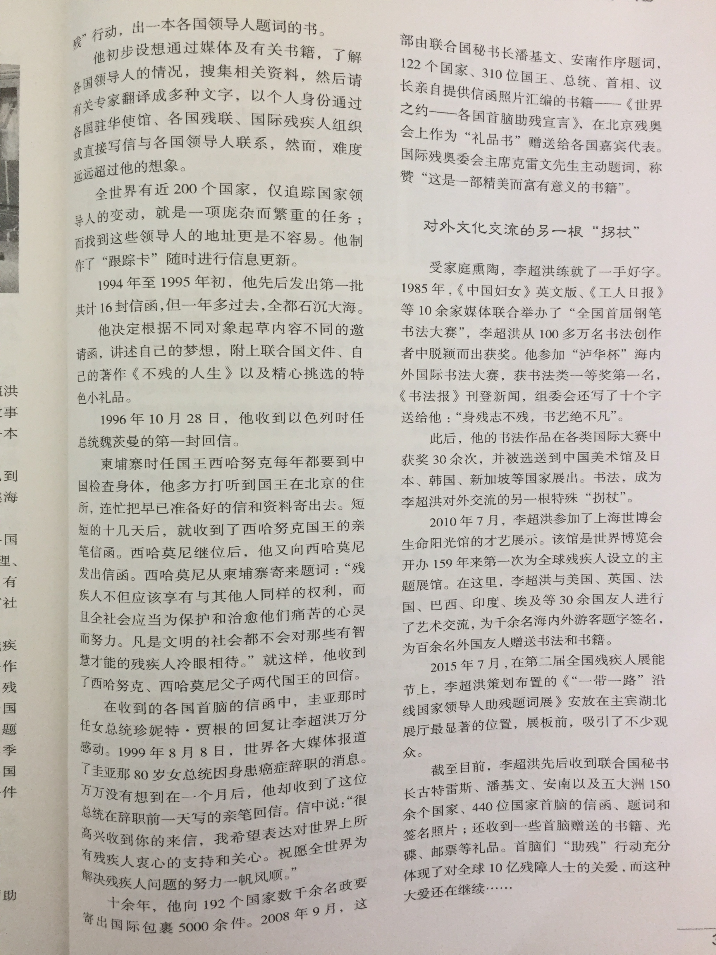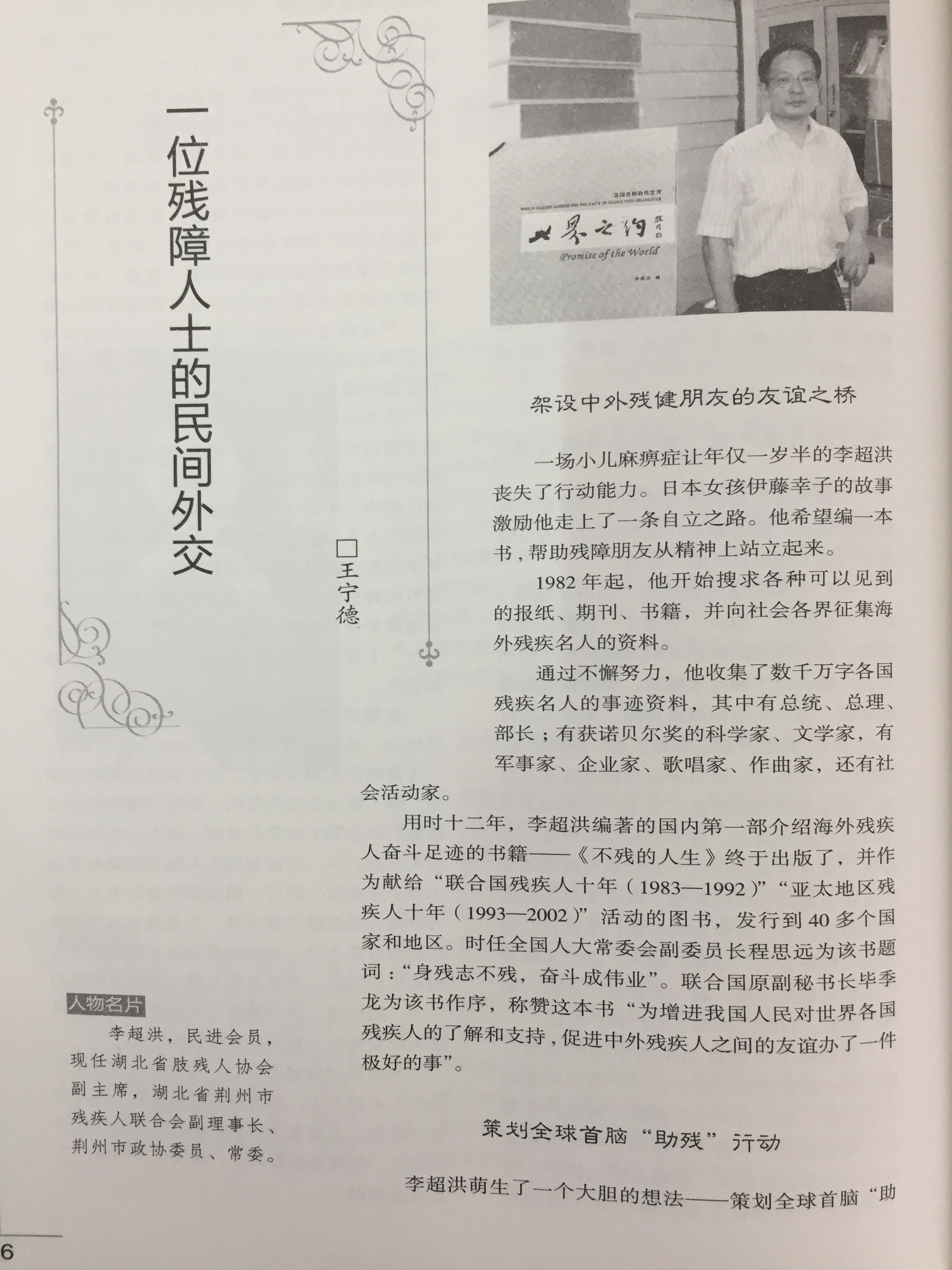 民进中央杂志《民主》2018年(总345期),刊登了我会会员李超洪的民间外交事迹,文中介绍了30多年来他与多国元首的外交事例以及他在书法上所取得的成绩。他通过多年的拼搏努力,实现了一个又一个梦想:从一名依靠拐杖行走的残疾人到全国“五一”劳动奖章获得者,从一名书法爱好者到上海世博会为中外政要展示的“世博书法家”,从一名普通文秘人员到编著16部图书、出版“国礼书”的“残奥作家”。李超洪多次接受新华社、人民日报和外国媒体的采访,让世界了解一名民进会员的梦想,也让世界分享一名中国残疾人的成功和喜悦。