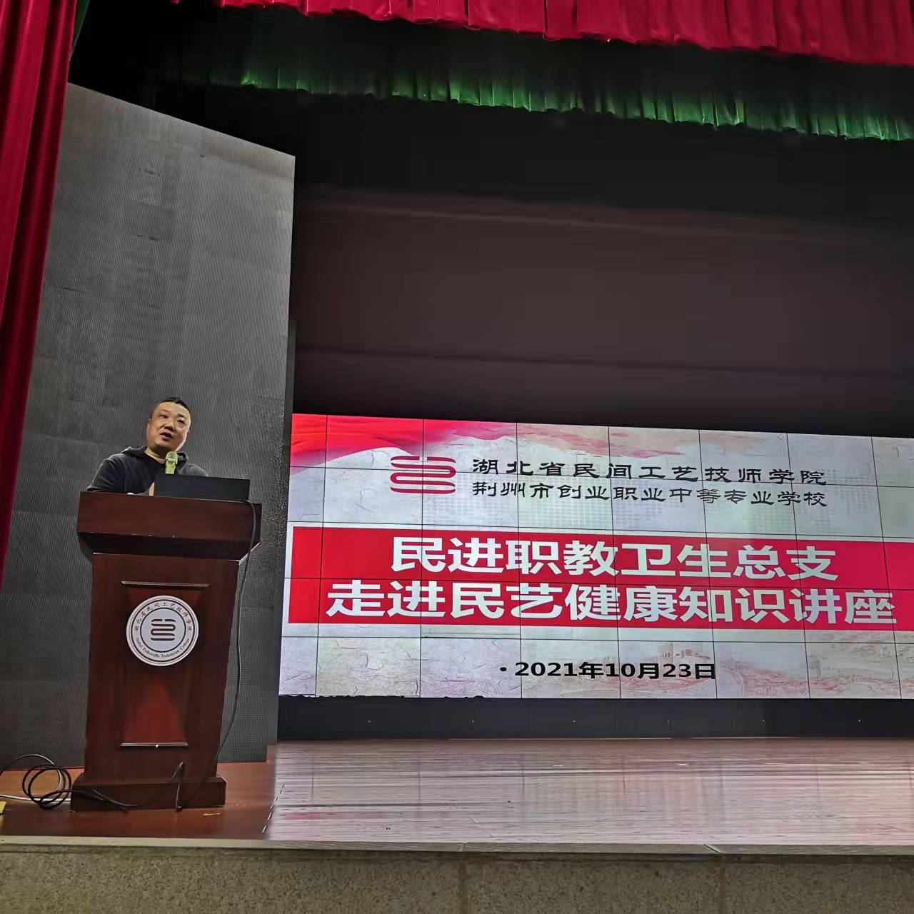 10月23日下午,民进荆州市职教卫生总支在湖北省民间工艺技师学院传承院会议大厅开展了健康知识讲座,为该院师生送上健康知识大餐。职教卫生总支主任陈丁丁,副主任王文付、杨亚涛、唐翔宇及骨干会员参加活动,市委会监督委员会副主任贺勇应邀参加。