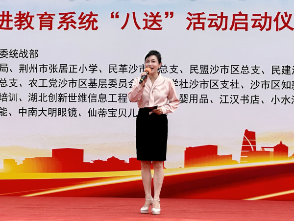 启动仪式上,盛志宏对活动情况进行详细介绍,深入阐述“八送”服务如何精准对接教育实际需求;宋光辉发表致辞,向支持教育事业的社会各界表达诚挚感谢,并表明推动沙市教育高质量发展的坚定决心。“同心志愿者”旗帜授旗仪式庄严进行,鲁娟将旗帜授予农工党沙市区基层委员会副主委廖培悦,标志着公益志愿服务力量正式集结。协办单位代表许欣发出公益倡议,呼吁更多力量投身教育帮扶工作。随后,余松柏宣布活动正式启动。 活动中,民进沙市区总支积极践行“八送”服务理念,以实际行动彰显责任担当。