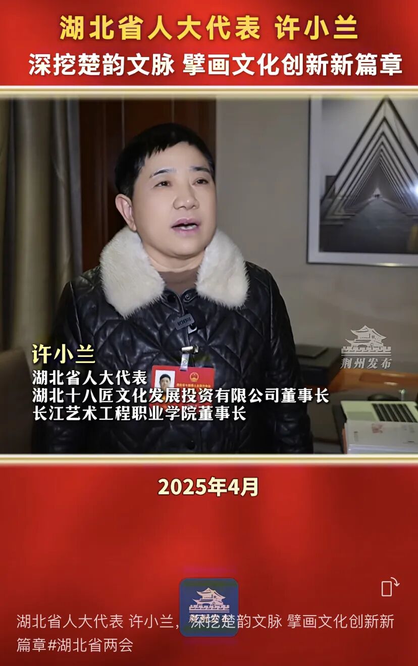 许小兰接受媒体采访,她以《深挖楚韵文脉 擘画文化创新新篇章》为主题,结合湖北省文化创新战略部署,就楚文化传承与创新发展提出建议:一是完善规划设计“三线一轴”方案;二是实施楚文化资源活化利用“三大工程”;三是系统推进楚文化“三大板块”文博事业;四是优先支持荆州建设楚文化教育“职业本科”。许小兰的建议贴合本土、务实进取,为推动楚文化创造性转化、创新性发展提供了实践参考与实施路径。